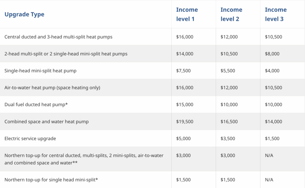Up to 100% of the upgrade cost can be covered for households switching from natural gas or propane to an electric heat pump. This table shows the maximum rebates by income level and heat pump type.
